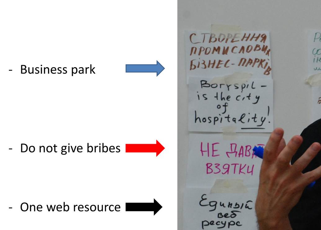 The 2025 vision for the City of Boryspil identified the three overarching categories: Boryspil is the City of Hospitality, Drive into the Future, and Everything for Everyone. It doesn’t quite translate into English as well, but the main insight in this session came from the Mayor and City Officials who noted that what they were able to accomplish in half-day was much more powerful and unifying than the strategic plan they worked on for over 6 months and were trying to communicate/sell to the public (which we learned was their original intent for participating in this engagement project).